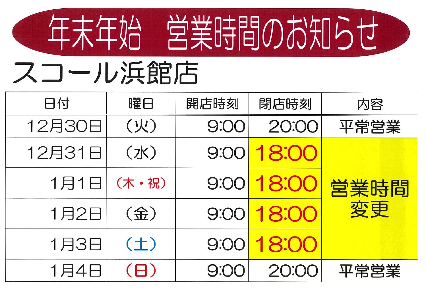 お知らせ2025年12月13日お知らせ【スコール浜館店】年末年始 営業時間のお知らせ一覧へ戻る新着情報【スコール大野店】年末年始 営業時間のお知らせ【スコール本店】年末年始 営業時間のお知らせ【スコール浜館店】年末年始 営業時間のお知らせカテゴリーお知らせ6アーカイブ 2025年12月 2022年10月