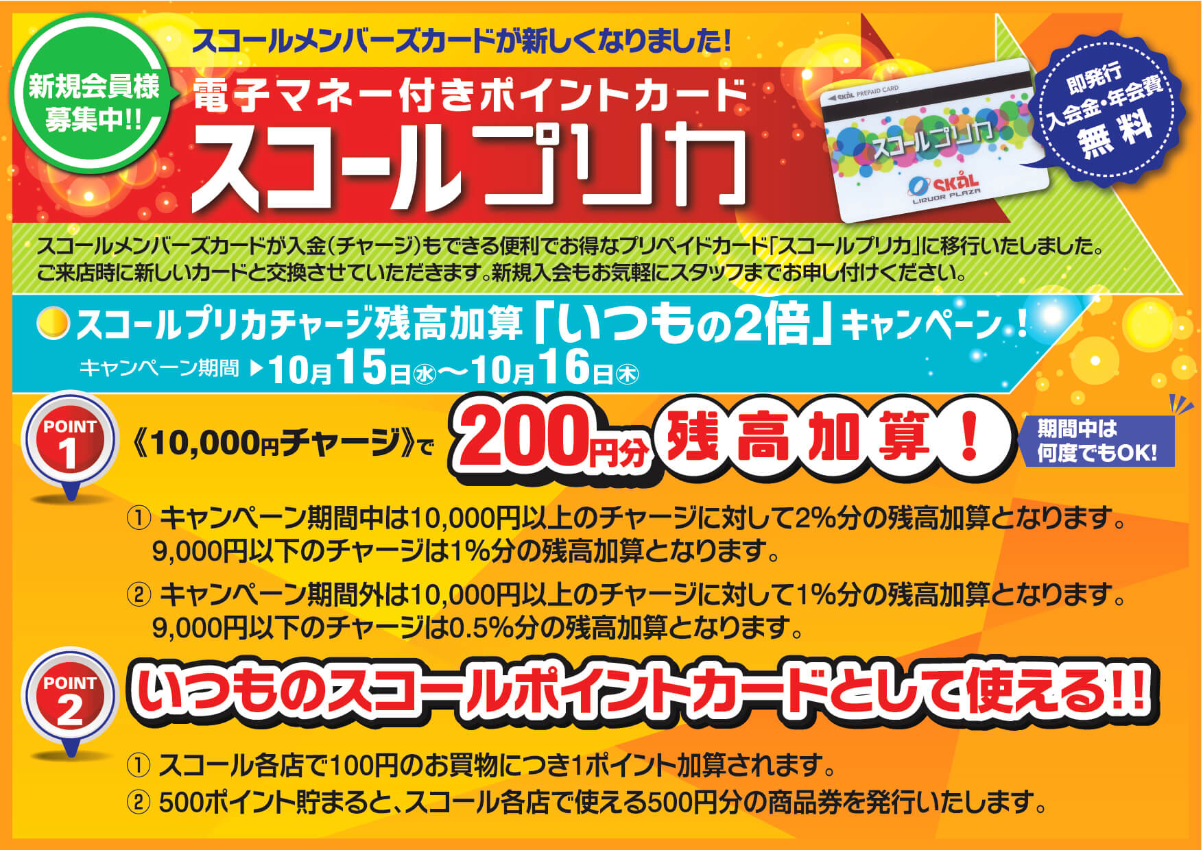 お知らせ2025年10月8日お知らせスコールプリカチャージ残高加算「いつもの2倍」キャンペーン(期間:10月15日㊌~10月16日㊍)期間:10月15日㊌~10月16日㊍ 内容:10,000円チャージで200円分残高加算!(期間中は何度でもOK!) これを機に是非スコールへご来店よろしくお願いいたします! 一覧へ戻る新着情報スコールプリカチャージ残高加算「いつもの2倍」キャンペーン(期間:10月15日㊌~10月16日㊍)飲食店開店希望の方へ!!カテゴリーお知らせ2アーカイブ 2025年10月 2022年10月