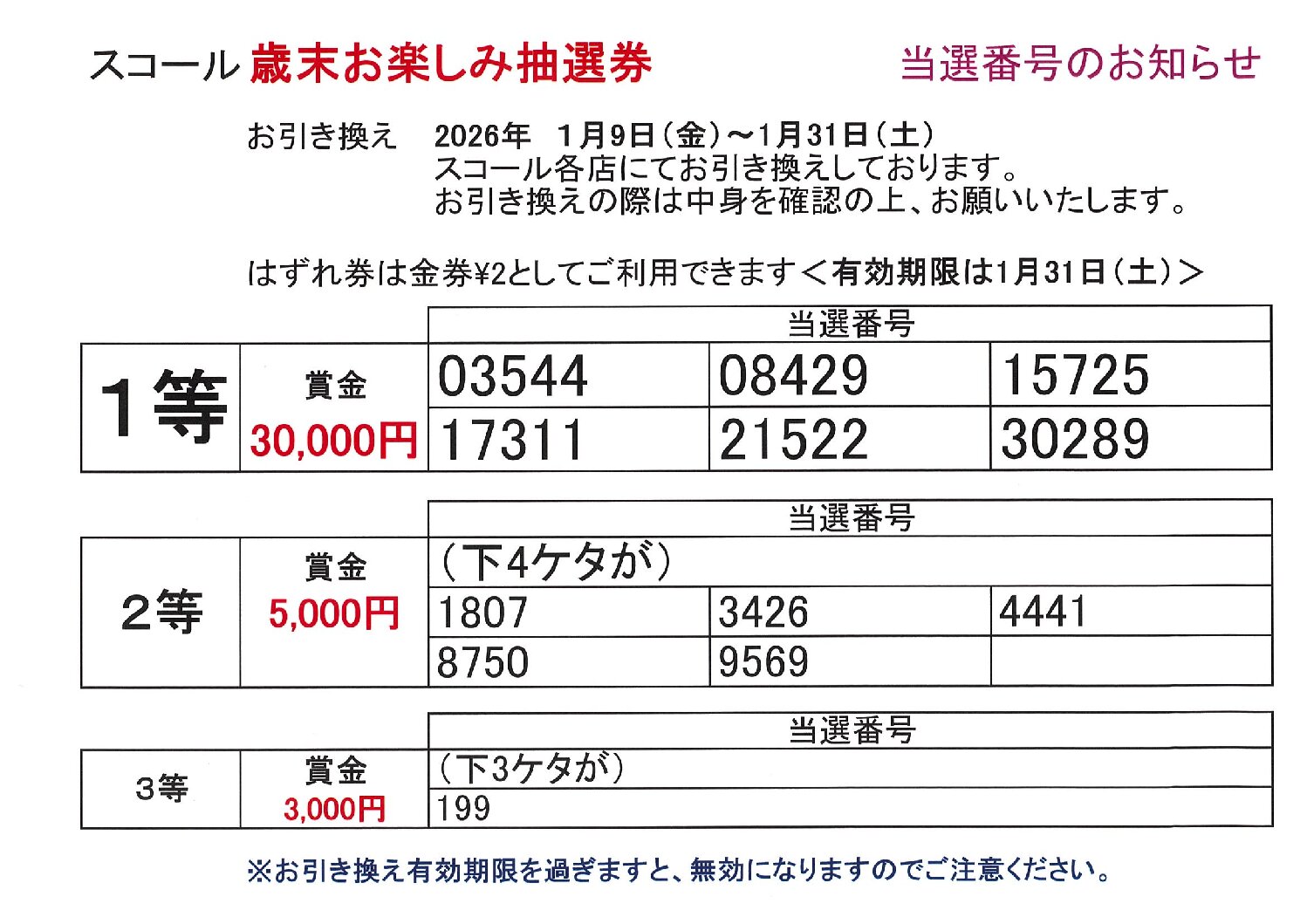 「2025年スコール歳末お楽しみ抽選券」当選発表!!
